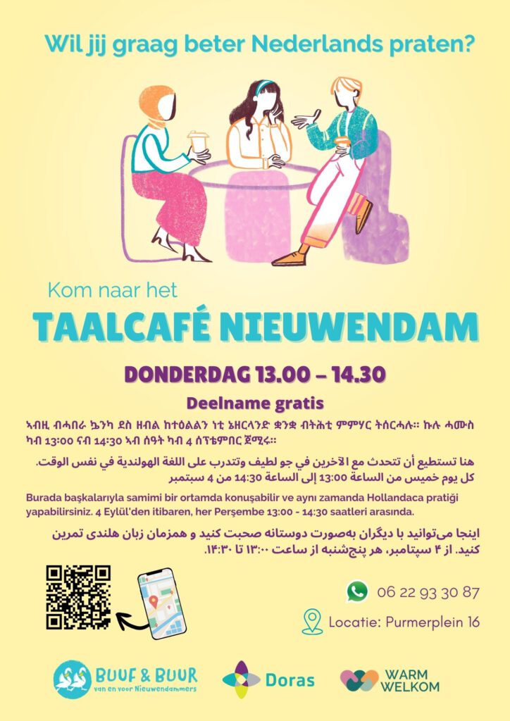 In de Nieuwendammerbuurt was er ook behoefte aan een manier om nieuwkomers meer te betrekken bij de buurt. Hier helpen we Buuf & Buur samen met Doras en Ymere om het taalcafé op te zetten. Het vraagt immers wel wat professionaliteit om vrijwilligers te begeleiden en deelnemers vertrouwen te geven. Onze ervaringen delen we graag.