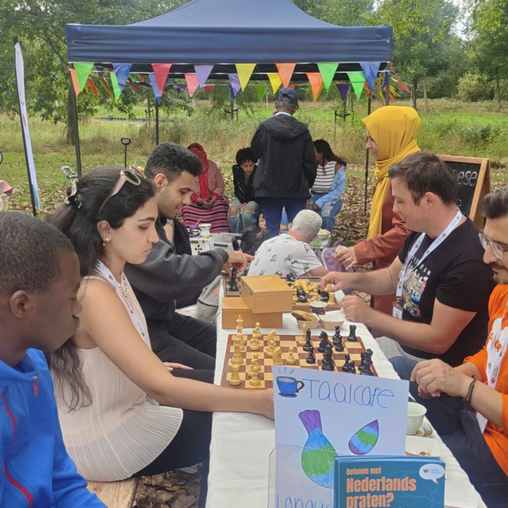 Ook dit jaar waren we weer aanwezig op het Alles is Noord Feest. Dit keer naast Eritrese koffie, ook met Arabische koffie en Jemenitische thee en lekkernijen. Daarbij nodigden we de bezoekers uit om dit in een andere taal te vragen. “Qahwa min fadlik” is bijvoorbeeld Arabisch voor “Mag ik koffie, alstublieft” of “Boen” is het woord voor koffie in Tigrinya (Eritrese taal). Wat begon als een spel, werd al snel gesprek. Ook kon men een potje schaken of dammen, taal is niet altijd nodig om samen een spelletje te kunnen doen.