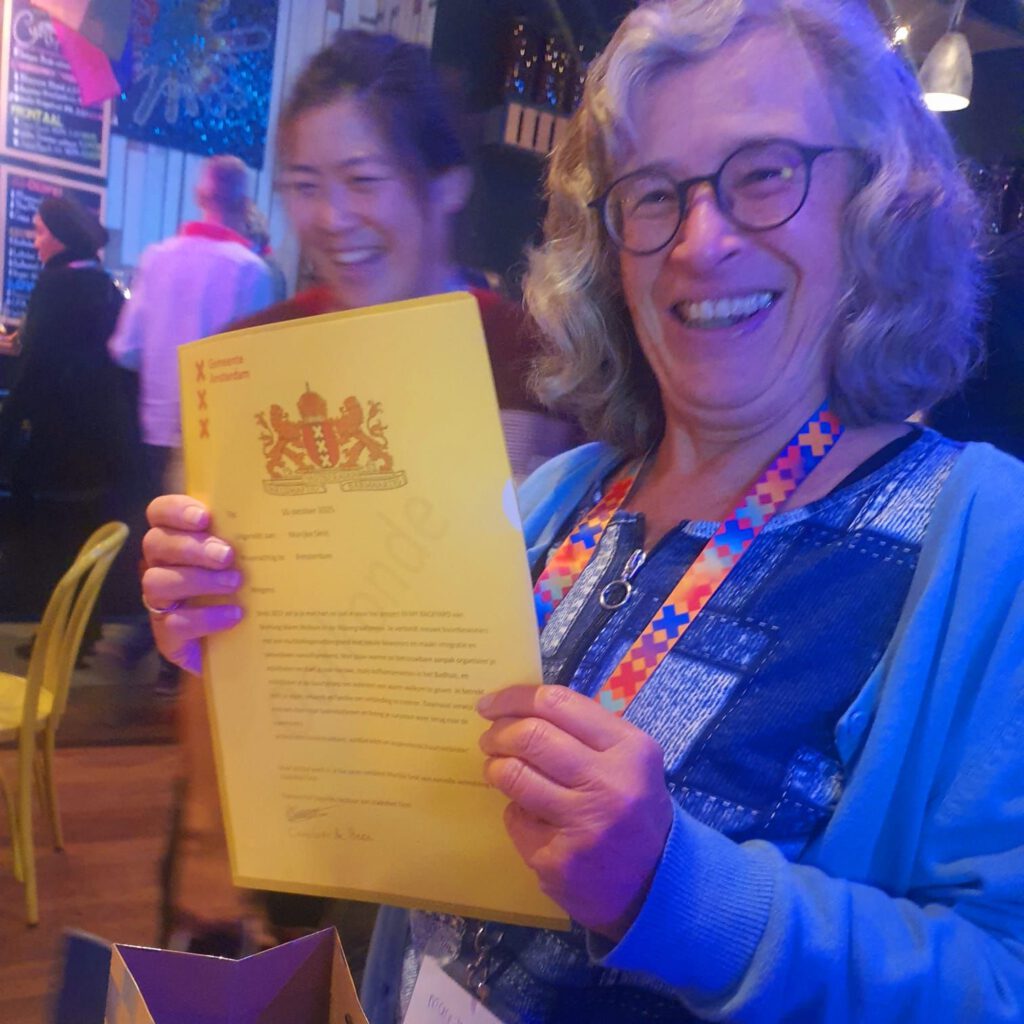 Op 16 oktober ontving onze trouwe en lieve IMBY-er Marijke Smit een erespeld op het vrijwilligersfeest in Oost. Dik verdiend vinden wij, want Marijke is al vanaf het allereerste begin van IMBY betrokken, verbindt nieuwkomers aan allerlei contacten en zet zelfs haar eigen familie in bij onze activiteiten.