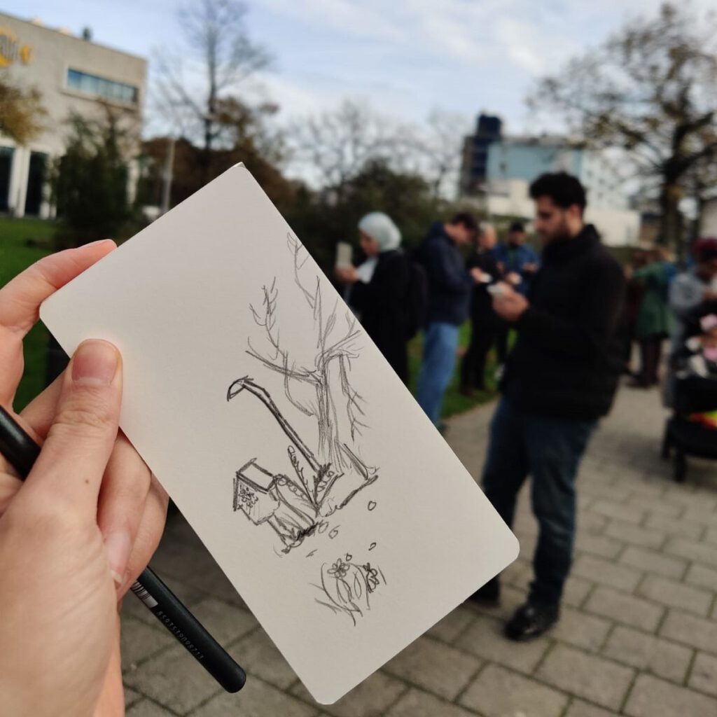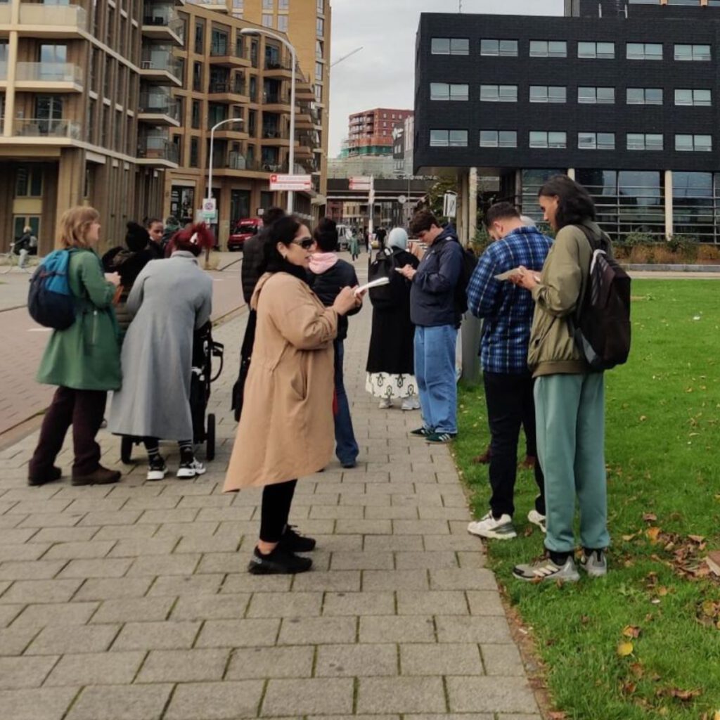 Iedere dinsdag en vrijdag is er op de Modestraat het Praatcafé. Dit wordt goed bezocht en is het naast leerzaam ook heel gezellig! Zo trok een groep van het praatcafé er samen op uit voor een tekenwandeling. Buiten oefenden ze hun Nederlands terwijl ze tekenden en met elkaar in gesprek gingen over wat ze zagen. De tekeningen kregen later een plek in het nieuwe kinderkunstmuseum bij Station Noord.